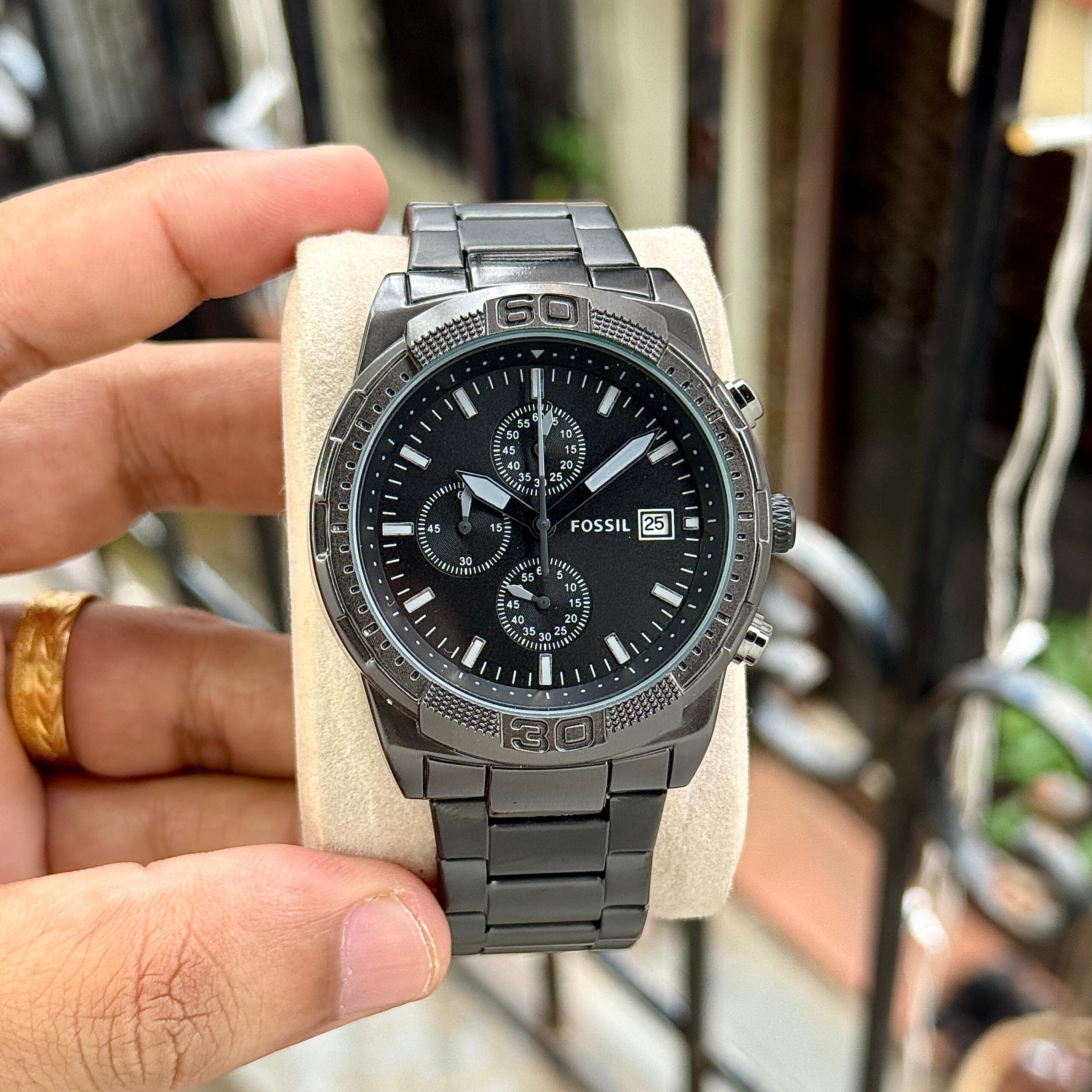 ➡️ Full Black Stainless Steel Case – Textured Bezel with Brushed Finish